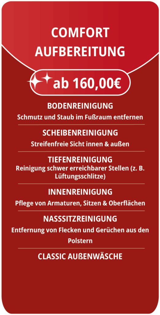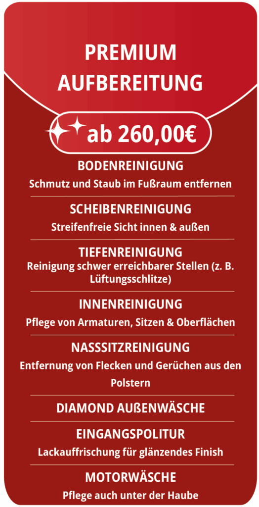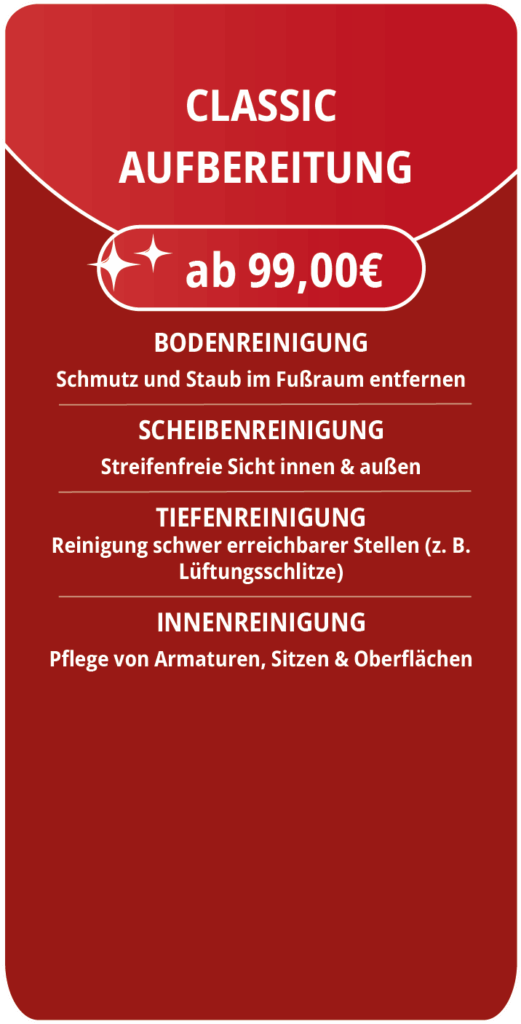 Viele unserer Pflegeleistungen bieten wir Ihnen spontan und ohne Termin an. Für umfangreichere Services – wie etwa die Fahrzeugaufbereitung oder stark verschmutzte Innenräume – empfehlen wir eine vorherige Terminvereinbarung, damit wir ausreichend Zeit für Ihr Anliegen einplanen können.